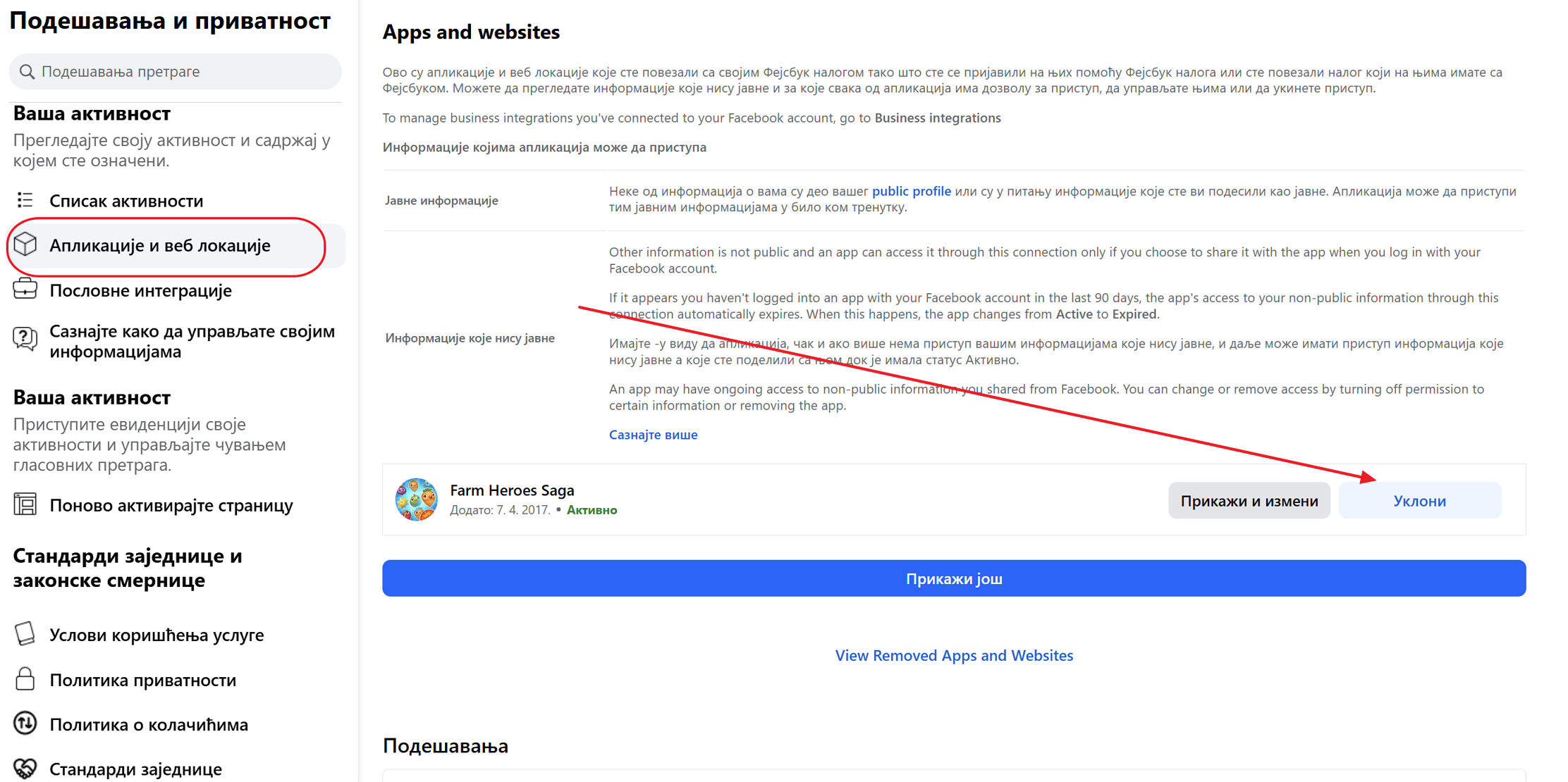 Pristup možete onemogućiti tako što ćete kliknuti na Ukloni, kao što je prikazano na slici. Ovu radnju ponovite za sve aplikacije koje više ne koristite.