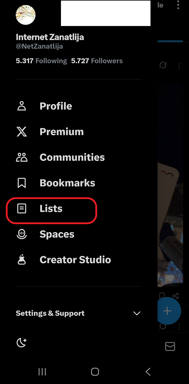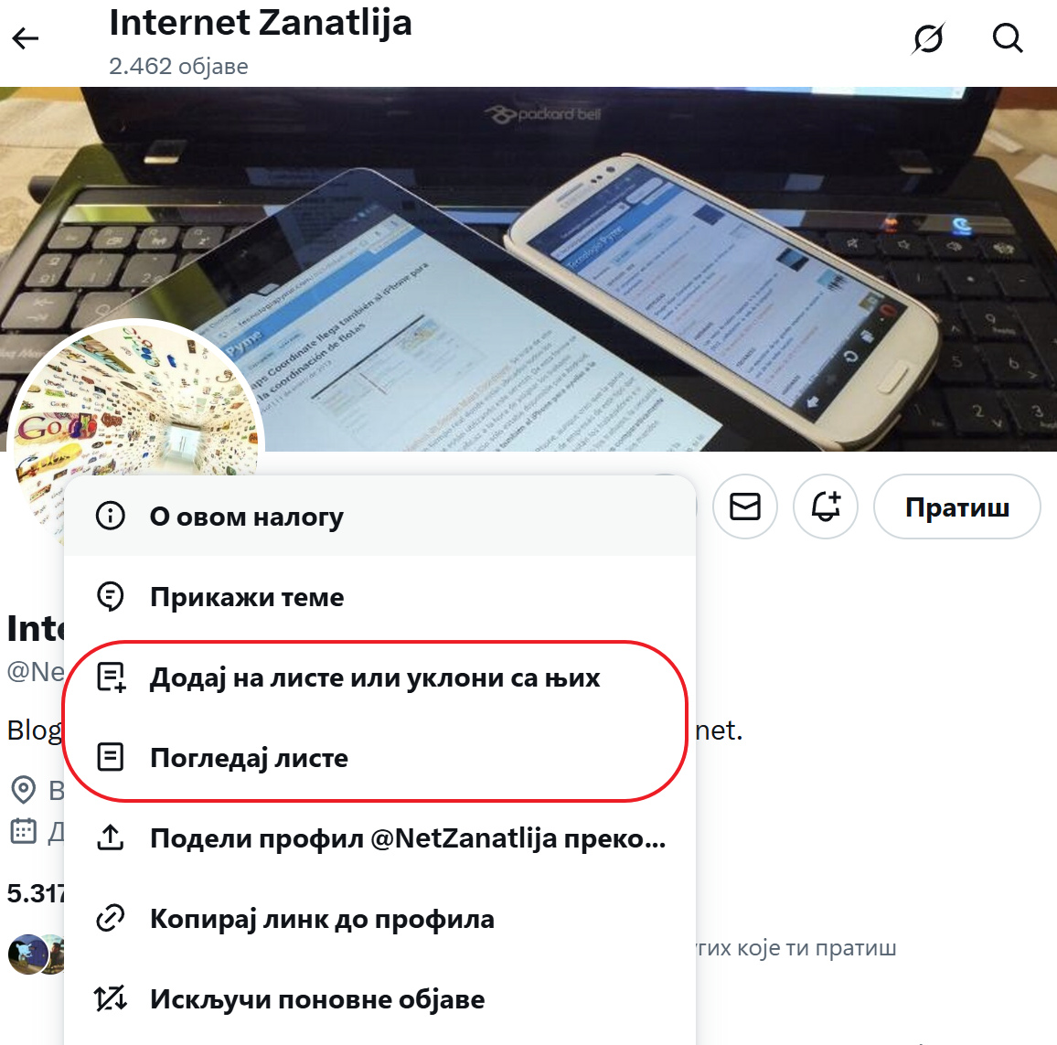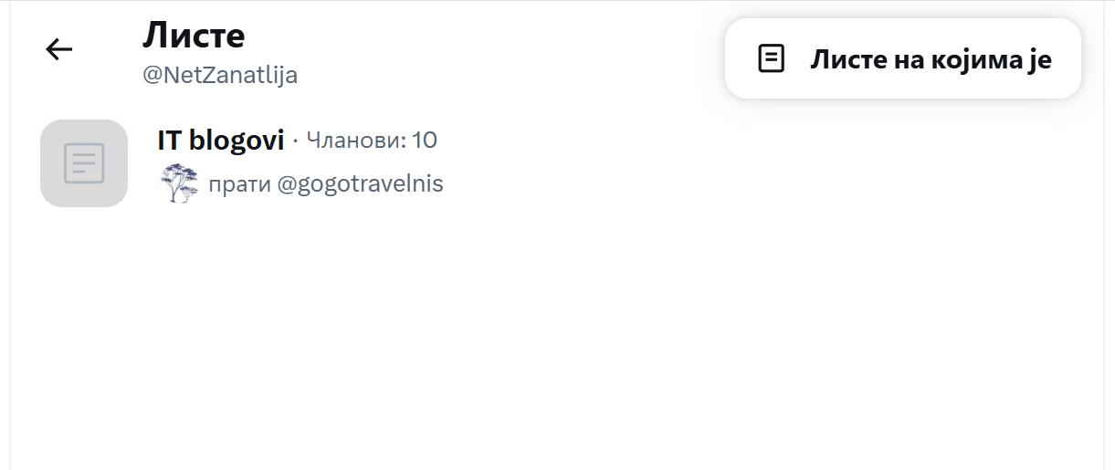 Ako želite da vidite na kojim listama se određeni nalog nalazi, kao i koje javne liste prati, potrebno je da dodate /lists na njegovu URL adresu. Na primer, da https://twitter.com/netzanatlija postane https://twitter.com/netzanatlija/lists.
