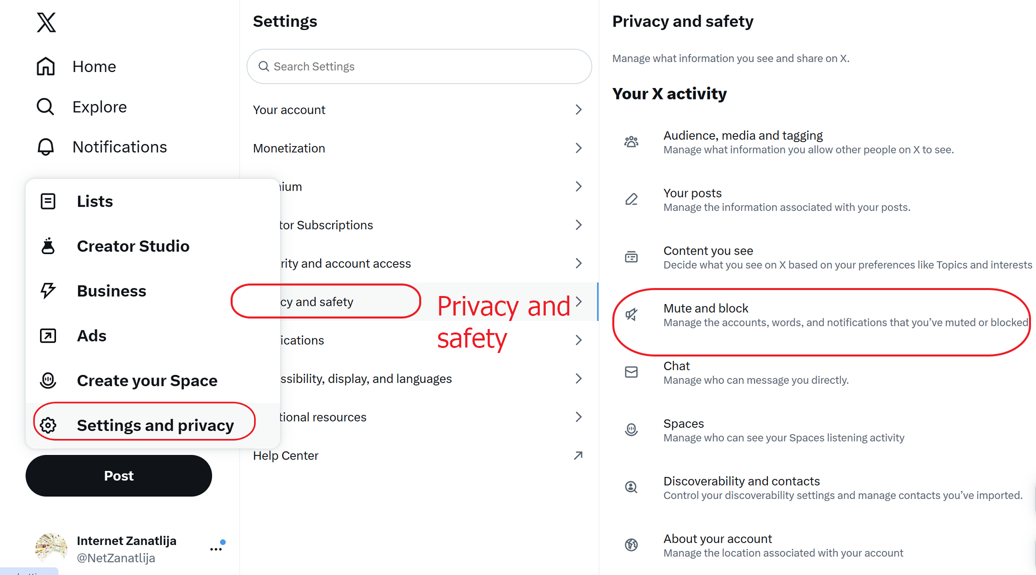Bilo da se ste u aplikaciji ili na vebu treba da odete na Podešavanja, pa na Bezbednost (Safety & Privacy) i tu potražite stavku Muted words (Ignorisane reči) ili Muted Accounts (Ignorisani nalozi).