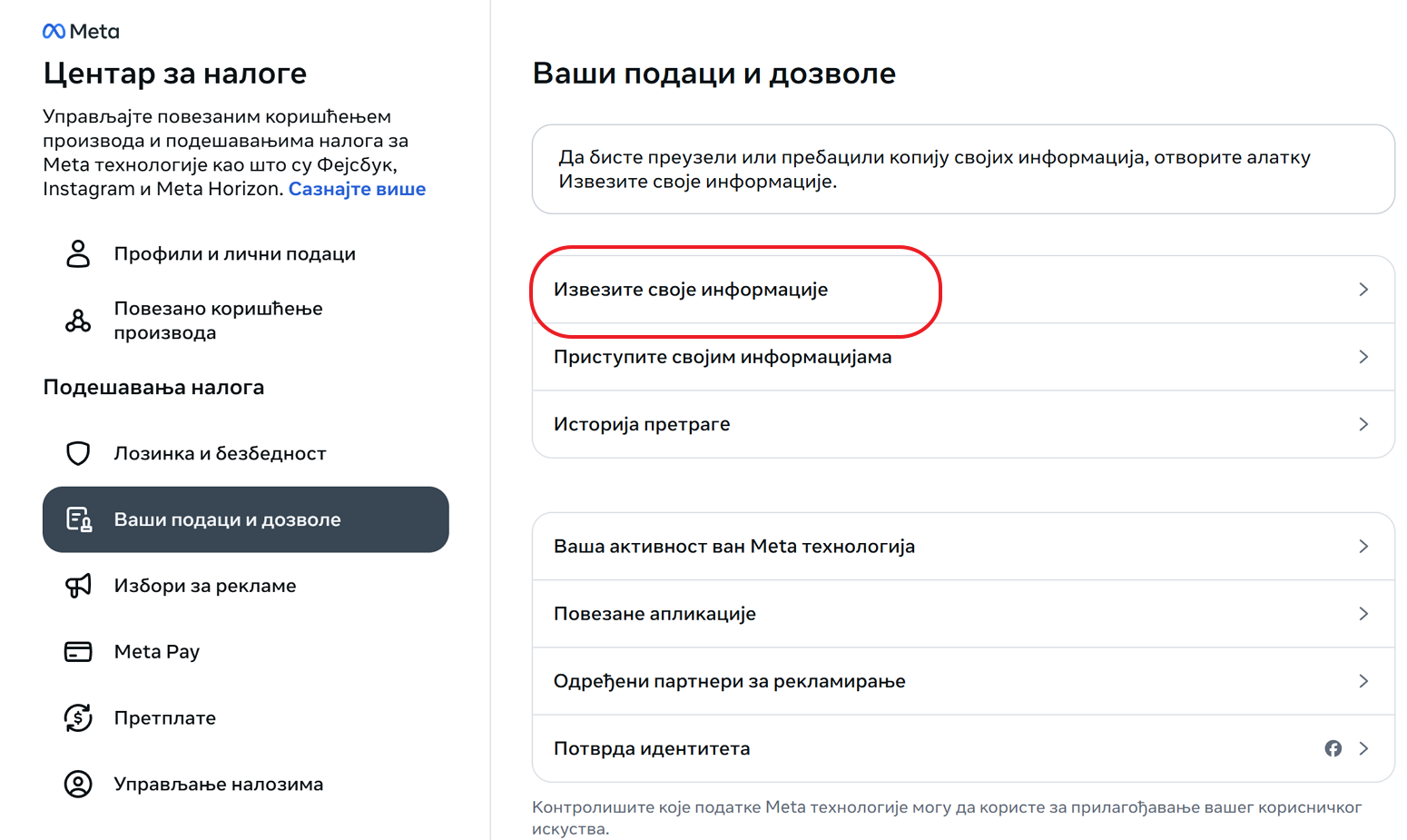Uđite u Settings & privacy (Podešavanja i privatnost), zatim u Settings (Podešavanja), pa otvorite odeljak Meta centar za naloga. Tamo se nalazi mogućnost za izvoz podataka. Kada je otvorite, možete izabrati koje podatke želite da preuzmete (objave, fotografije, poruke, listu prijatelja) i u kom formatu.
