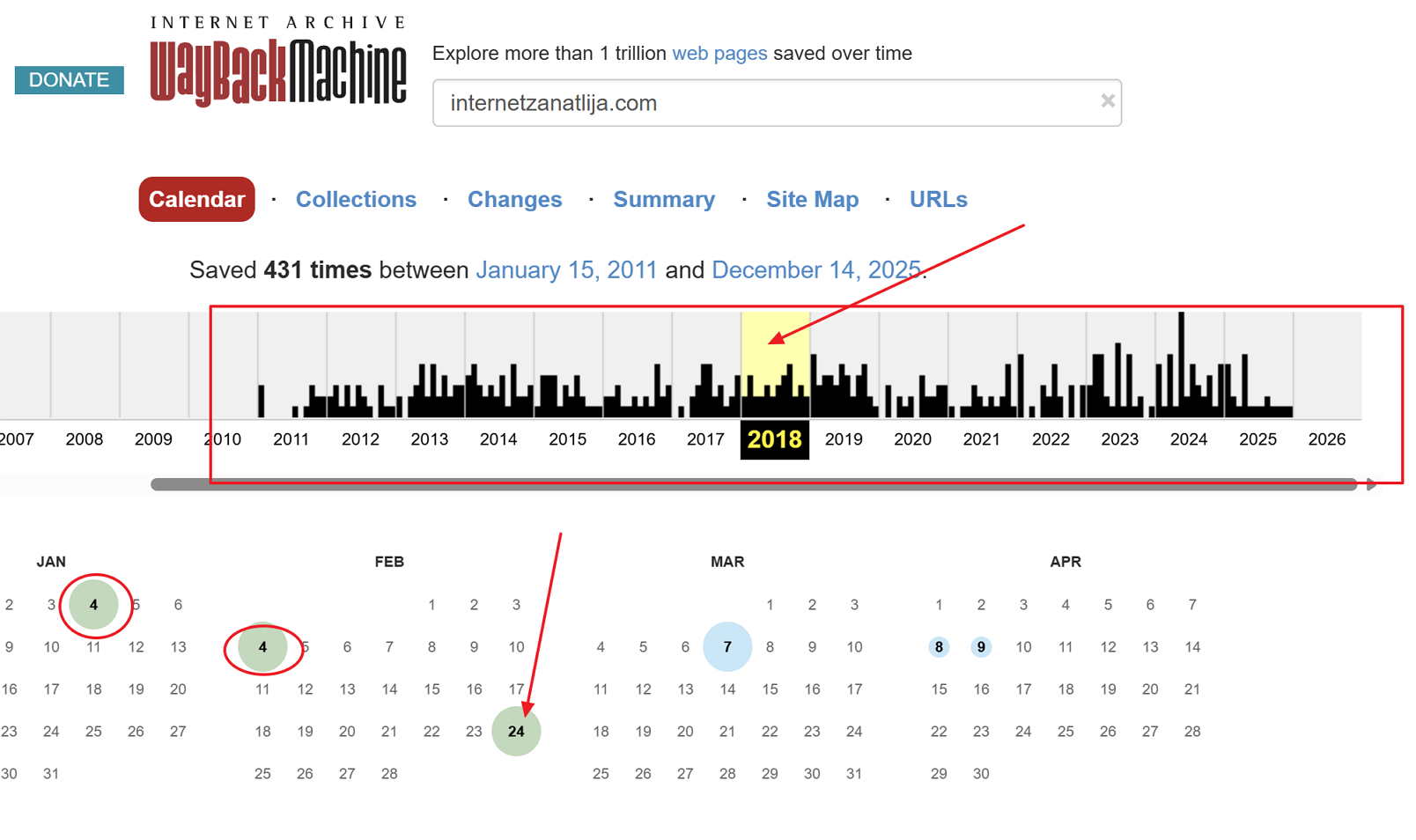 Izaberite godinu koja vas zanima, a zatim odaberite željeni mesec. Meseci i dani za koje postoji sačuvana stara verzija stranice označeni su plavim ili zelenim kružićem.
