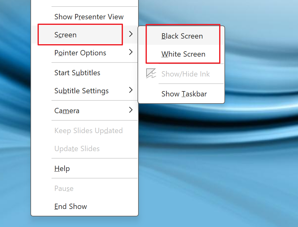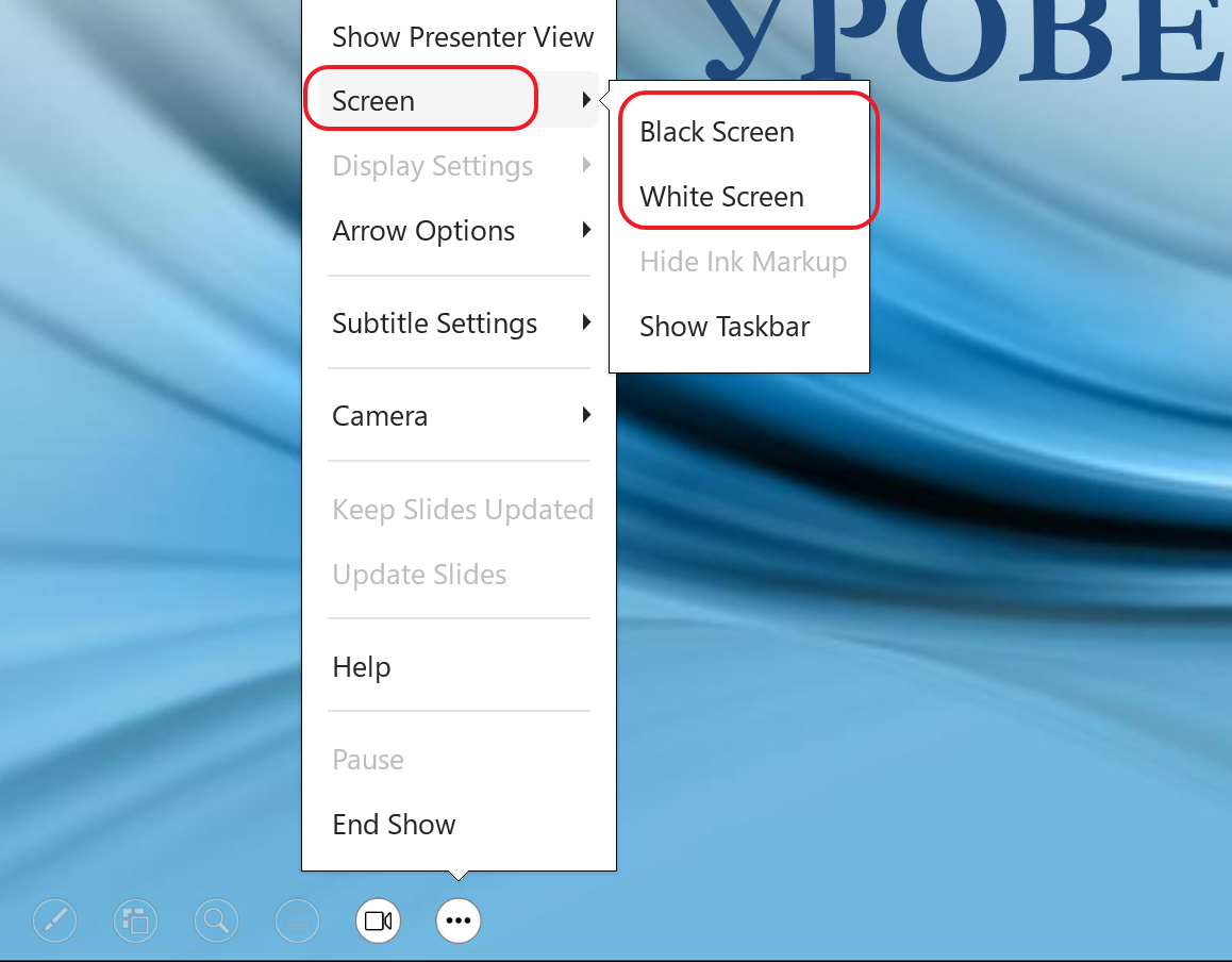 Tokom prikazivanja slajdova, klikom na ikonicu sa tri tačke u donjem levom uglu ekrana otvara se dodatni meni. U okviru stavke Screen (Ekran) moguće je izabrati opciju Black Screen ili White Screen, u zavisnosti od željenog prikaza.