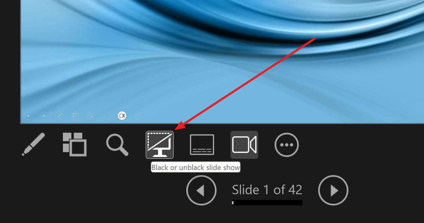 Klikom na ikonicu u obliku monitora, publika dobija crni ekran, dok izlagač zadržava potpunu kontrolu nad izlaganjem. Ponovnim klikom sadržaj se vraća na platno.
