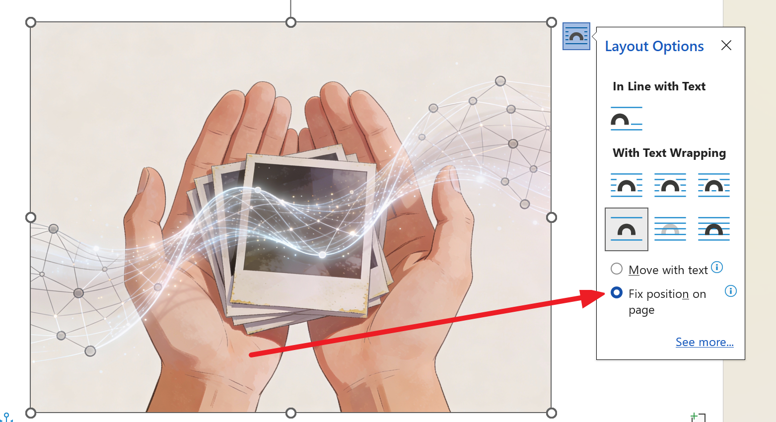 Prvi i najjednostavniji oslanja se na ono što bismo mogli nazvati digitalnim sidrom, odnosno opciju Fix Position on Page (Fiksiraj položaj na stranici). Kada sliku fiksirate na stranici u Wordu, nikakve promene neće uticati na nju. Ostaće tamo gde jeste. Možete dodavati pasuse, menjati redosled poglavlja ili ispravljati rečenice – slika u Word dokumentu ostaje tačno na mestu koje ste odabrali.