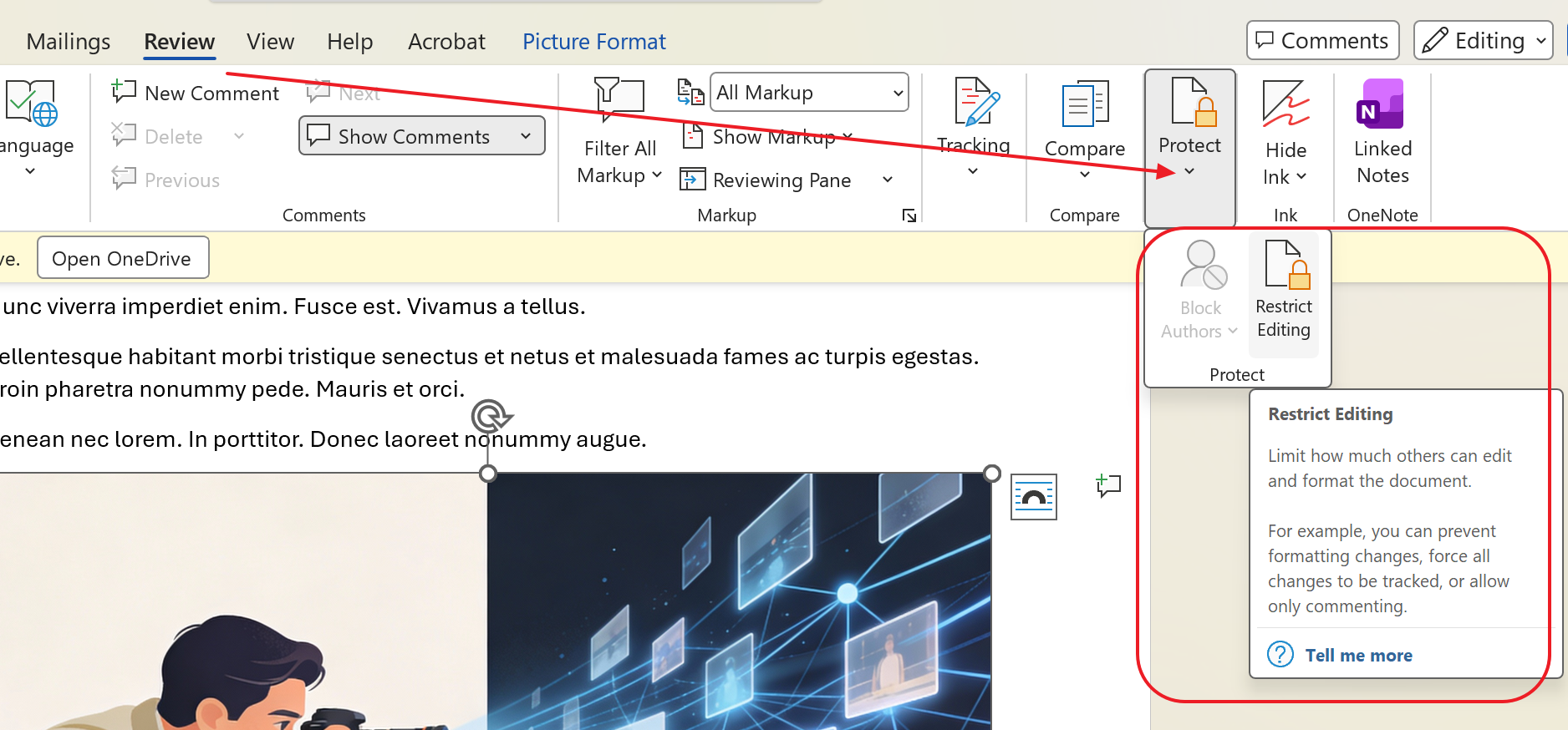 Drugi način posebno je koristan kada delite Word dokument sa saradnicima. Ako želite da sprečite pomeranje slika, grafikona ili dijagrama tokom zajedničkog rada, rešenje je u funkciji Restrict Editing u Wordu.