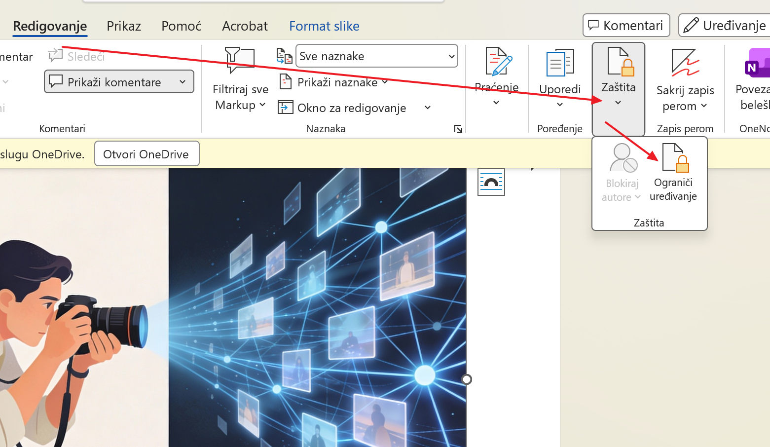Nakon što završite raspored elemenata, selektujte sliku, otvorite karticu Review (Redigovanje) i u okviru odeljka Protect (Zaštita) izaberite Restrict Editing (Ograniči redigovanje).