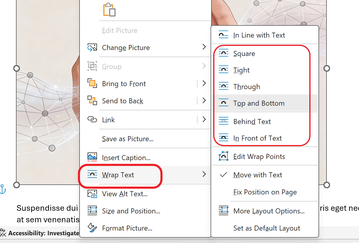 Postupak je jednostavan. Kada fotografiju ubacite, potrebno je da podesite prelom teksta oko slike u Wordu. Desnim klikom otvorite Wrap Text i izaberite bilo koji režim osim „In Line with Text“ (Uravnato sa tekstom).
