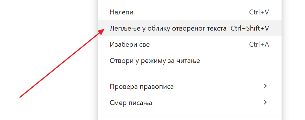 Ako ne koristite prečice na tastaturi ili ste na mobilnom uređaju ili tabletu, kliknite desnim tasterom miša (ili dugi stisak prsta) u polje za unos teksta i izaberite opciju „Lepljenje u obliku otvorenog teksta“ (ili „Paste as plain text“, u zavisnosti od jezika sistema).