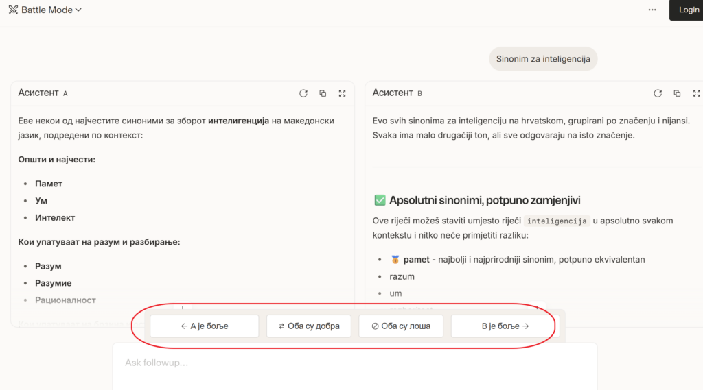 Tek nakon što korisnik izabere bolji odgovor, otkriva se koji su modeli učestvovali u poređenju.