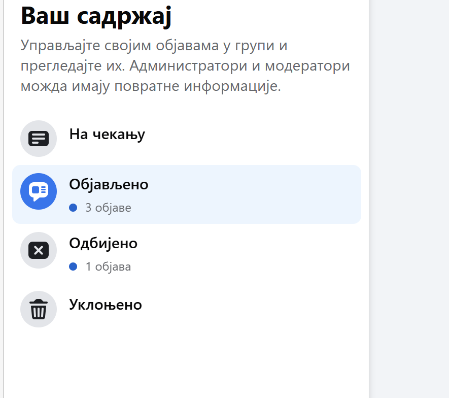 U mnogim Fejsbuk grupama objave ne idu odmah na zid. Administrator ili moderator najpre proverava sadržaj, pa tek onda odlučuje da li će ga odobriti ili ne. Tako nam se može desiti da nešto objavimo, a posle ne znamo šta se sa tim desilo. Gde je objava nestala? Da li je odbijena ili ne? Srećom, na Fejsbuku sve se da proveriti.