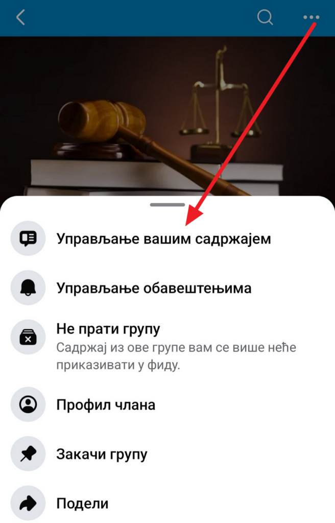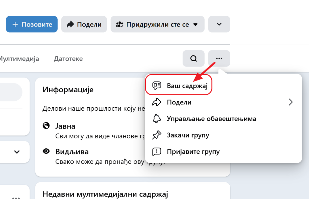 Uvid u to šta se desilo sa vašim objavama najlakše je ostvariti kroz sekciju posvećenu vašem sadržaju. Dakle otvorite grupu i pritisne više informacija.